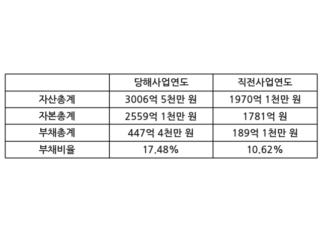 또한, 이번사업연도의 자산총계는 3006억 5천만 원으로 직전사업연도 대비 52.61% 증가한 한편, 부채총계는 447억 4천만 원으로 136.62% 증가, 자본총계는 2559억 1천만 원으로 43.69% 증가했다.