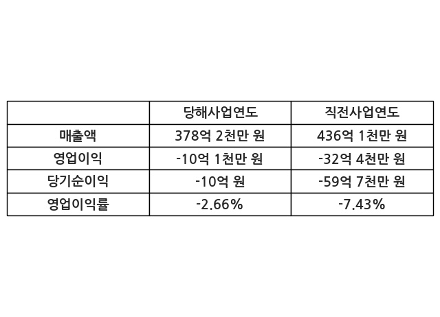 이번사업연도의 매출액은 직전사업연도 대비 -13.28% 감소한 378억 2천만 원, 영업이익은 -10억 1천만 원, 당기순이익은 -10억 원이라고 공시했다.