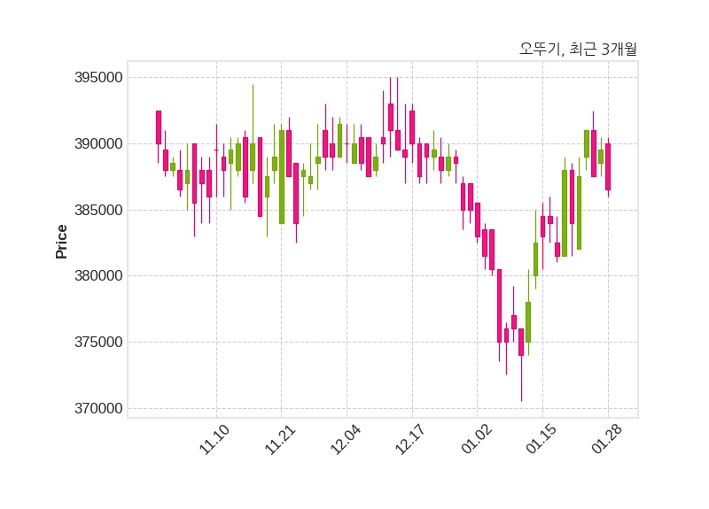 한편, 오뚜기의 15시 02분 현재주가는 386,500원으로 직전 거래일 대비 3,000원(-0.77%) 하락이며, 거래량은 7,855주이다.