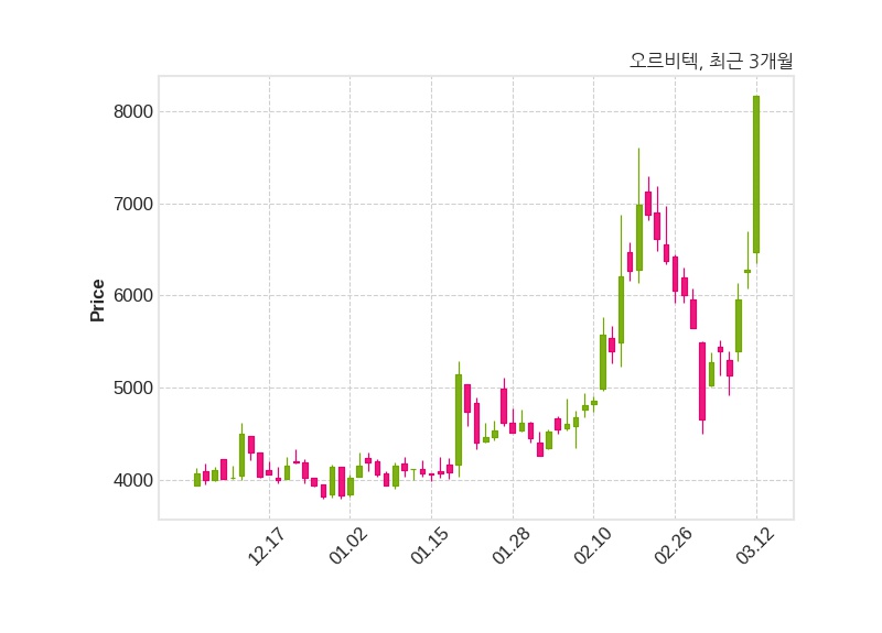 한편, 오르비텍의 15시 11분 현재주가는 8,160원으로 직전 거래일 대비 1,880원(+29.94%) 상승이며, 거래량은 22,742,304주이다.
