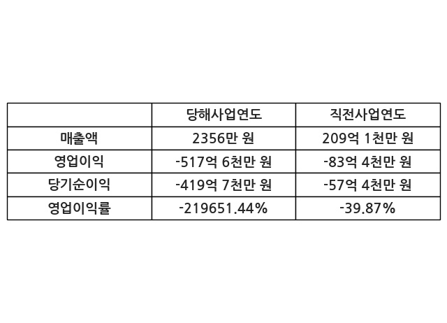 이번사업연도의 매출액은 직전사업연도 대비 -99.89% 감소한 2356만 원, 영업이익은 -517억 6천만 원, 당기순이익은 -419억 7천만 원이라고 공시했다.
