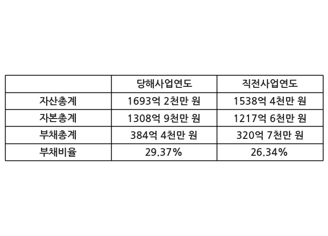 또한, 이번사업연도의 자산총계는 1693억 2천만 원으로 직전사업연도 대비 10.07% 증가한 한편, 부채총계는 384억 4천만 원으로 19.85% 증가, 자본총계는 1308억 9천만 원으로 7.49% 증가했다.