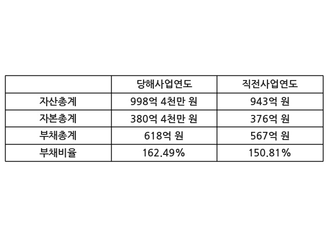 또한, 이번사업연도의 자산총계는 998억 4천만 원으로 직전사업연도 대비 5.88% 증가한 한편, 부채총계는 618억 원으로 9.0% 증가, 자본총계는 380억 4천만 원으로 1.17% 증가했다.