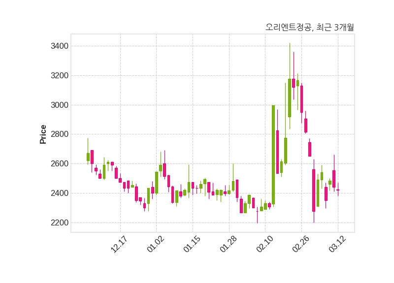 한편, 오리엔트정공은 장 마감 이후 해당 기업공시를 발표했으며 오늘 종가가 2,420원, 거래량은 338,229주로, 직전 거래일 대비 20원(-0.82%) 하락했다.