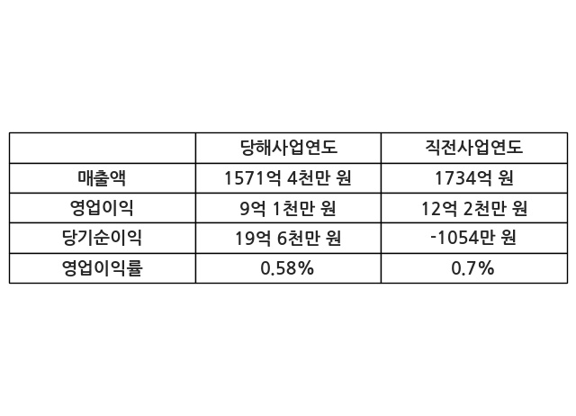 이번사업연도의 매출액은 직전사업연도 대비 -9.38% 감소한 1571억 4천만 원, 영업이익은 9억 1천만 원, 당기순이익은 19억 6천만 원이라고 공시했다.