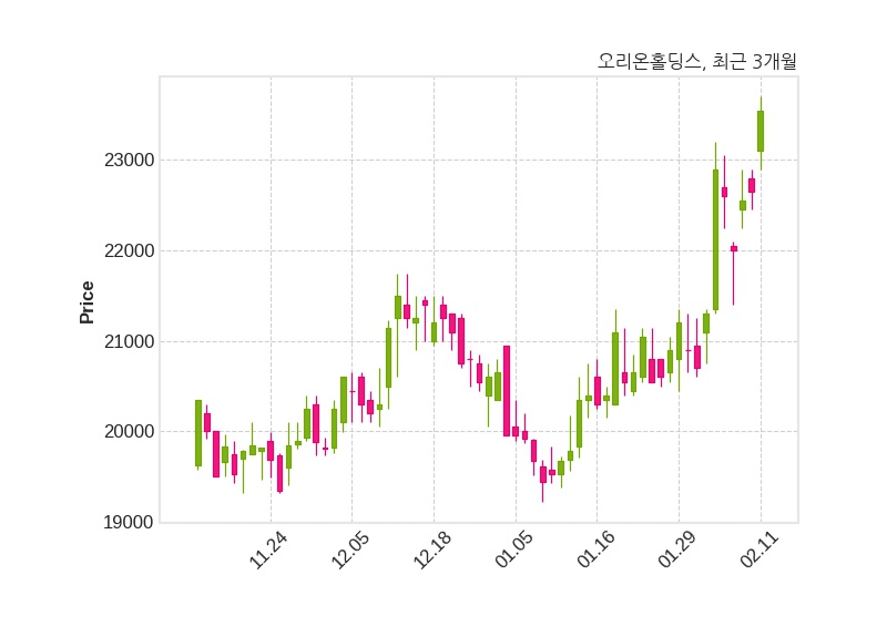 한편, 오리온홀딩스의 12시 32분 현재주가는 23,550원으로 직전 거래일 대비 900원(+3.97%) 상승이며, 거래량은 192,133주이다.