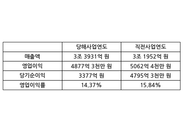 이번사업연도의 매출액은 직전사업연도 대비 6.19% 증가한 3조 3931억 원, 영업이익은 4877억 3천만 원, 당기순이익은 3377억 원이라고 공시했다.
