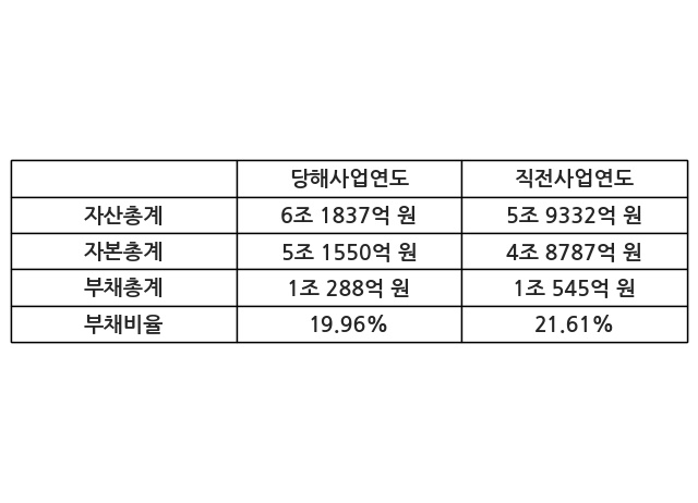 또한, 이번사업연도의 자산총계는 6조 1837억 원으로 직전사업연도 대비 4.22% 증가한 한편, 부채총계는 1조 288억 원으로 -2.44% 감소, 자본총계는 5조 1550억 원으로 5.66% 증가했다.