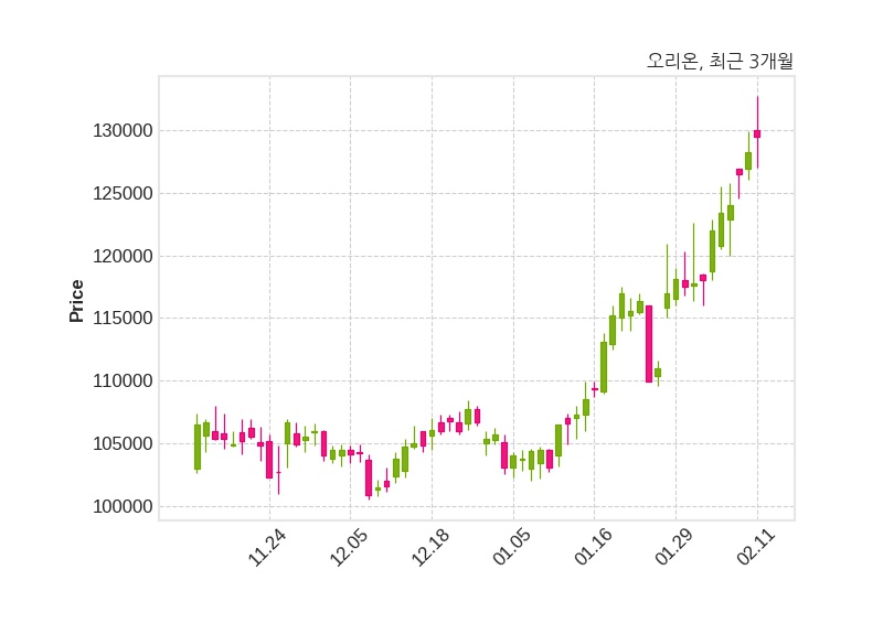 한편, 오리온의 11시 16분 현재주가는 129,500원으로 직전 거래일 대비 1,300원(+1.01%) 상승이며, 거래량은 64,211주이다.
