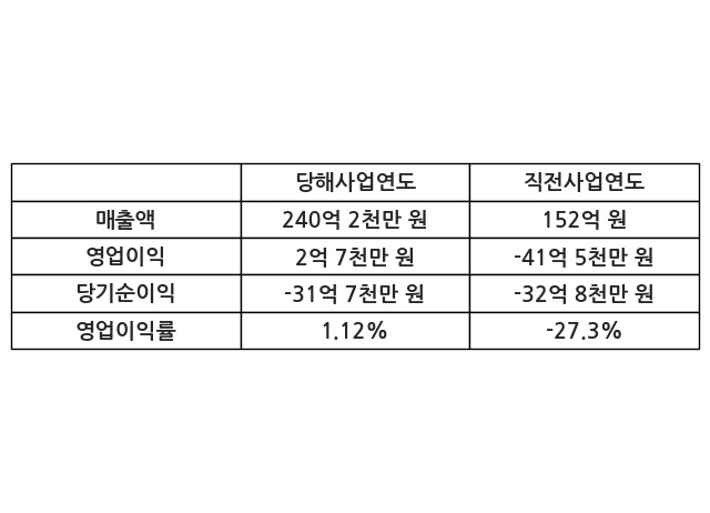 이번사업연도의 매출액은 직전사업연도 대비 57.99% 증가한 240억 2천만 원, 영업이익은 2억 7천만 원, 당기순이익은 -31억 7천만 원이라고 공시했다.