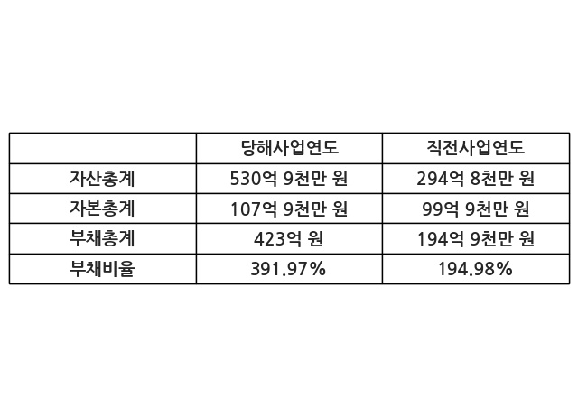 또한, 이번사업연도의 자산총계는 530억 9천만 원으로 직전사업연도 대비 80.07% 증가한 한편, 부채총계는 423억 원으로 117.05% 증가, 자본총계는 107억 9천만 원으로 7.96% 증가했다.