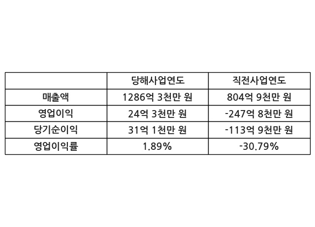 이번사업연도의 매출액은 직전사업연도 대비 59.81% 증가한 1286억 3천만 원, 영업이익은 24억 3천만 원, 당기순이익은 31억 1천만 원이라고 공시했다.