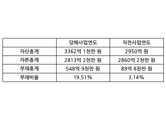또한, 이번사업연도의 자산총계는 3362억 1천만 원으로 직전사업연도 대비 13.97% 증가한 한편, 부채총계는 548억 9천만 원으로 511.06% 증가, 자본총계는 2813억 2천만 원으로 -1.64% 감소했다.