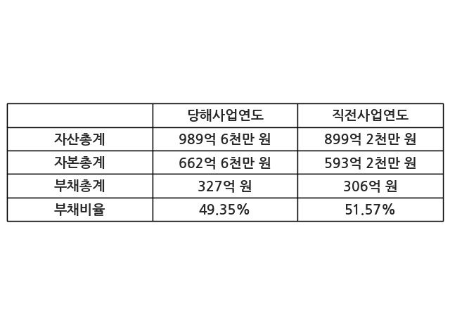 또한, 이번사업연도의 자산총계는 989억 6천만 원으로 직전사업연도 대비 10.05% 증가한 한편, 부채총계는 327억 원으로 6.87% 증가, 자본총계는 662억 6천만 원으로 11.69% 증가했다.