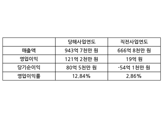 이번사업연도의 매출액은 직전사업연도 대비 41.53% 증가한 943억 7천만 원, 영업이익은 121억 2천만 원, 당기순이익은 80억 5천만 원이라고 공시했다.