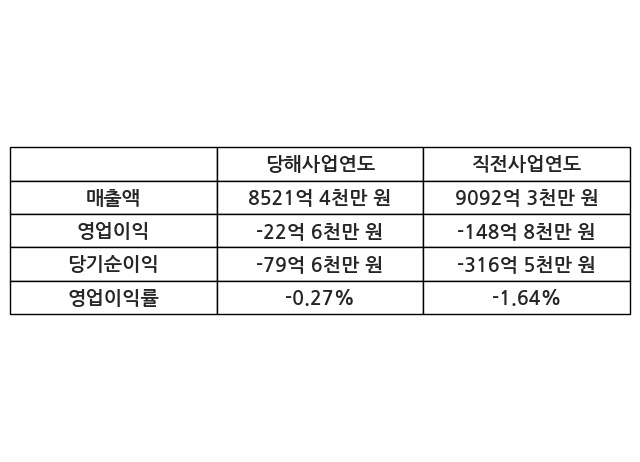 이번사업연도의 매출액은 직전사업연도 대비 -6.28% 감소한 8521억 4천만 원, 영업이익은 -22억 6천만 원, 당기순이익은 -79억 6천만 원이라고 공시했다.