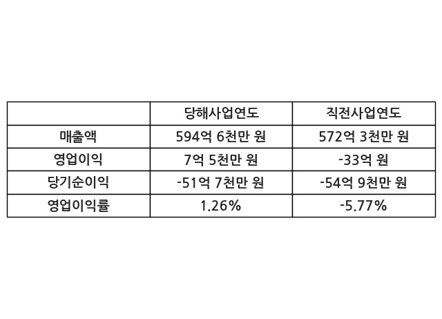이번사업연도의 매출액은 직전사업연도 대비 3.9% 증가한 594억 6천만 원, 영업이익은 7억 5천만 원, 당기순이익은 -51억 7천만 원이라고 공시했다.
