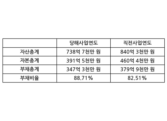 또한, 이번사업연도의 자산총계는 738억 7천만 원으로 직전사업연도 대비 -12.08% 감소한 한편, 부채총계는 347억 3천만 원으로 -8.58% 감소, 자본총계는 391억 5천만 원으로 -14.98% 감소했다.
