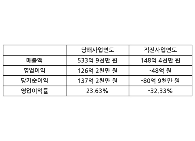 이번사업연도의 매출액은 직전사업연도 대비 259.82% 증가한 533억 9천만 원, 영업이익은 126억 2천만 원, 당기순이익은 137억 2천만 원이라고 공시했다.