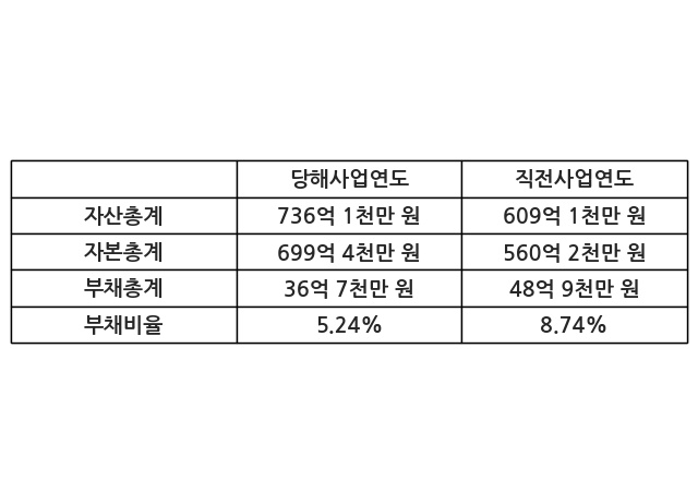 또한, 이번사업연도의 자산총계는 736억 1천만 원으로 직전사업연도 대비 20.84% 증가한 한편, 부채총계는 36억 7천만 원으로 -25.08% 감소, 자본총계는 699억 4천만 원으로 24.86% 증가했다.