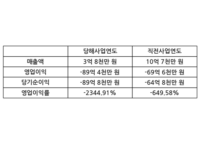 이번사업연도의 매출액은 직전사업연도 대비 -64.44% 감소한 3억 8천만 원, 영업이익은 -89억 4천만 원, 당기순이익은 -89억 8천만 원이라고 공시했다.