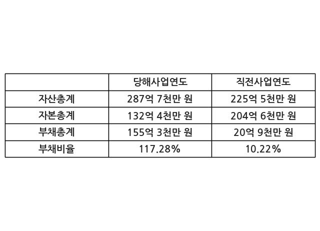 또한, 이번사업연도의 자산총계는 287억 7천만 원으로 직전사업연도 대비 27.6% 증가한 한편, 부채총계는 155억 3천만 원으로 642.67% 증가, 자본총계는 132억 4천만 원으로 -35.27% 감소했다.