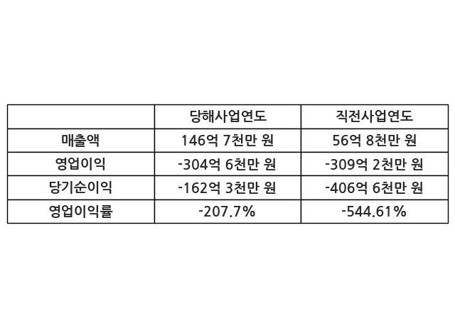 이번사업연도의 매출액은 직전사업연도 대비 158.35% 증가한 146억 7천만 원, 영업이익은 -304억 6천만 원, 당기순이익은 -162억 3천만 원이라고 공시했다.