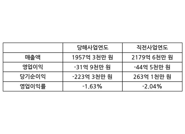 이번사업연도의 매출액은 직전사업연도 대비 -10.2% 감소한 1957억 3천만 원, 영업이익은 -31억 9천만 원, 당기순이익은 -223억 3천만 원이라고 공시했다.