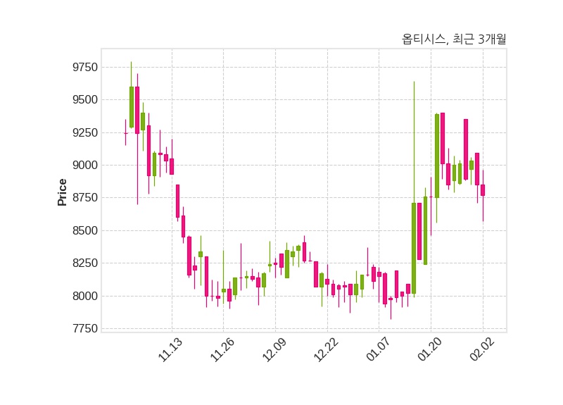 한편, 옵티시스는 장 마감 이후 해당 기업공시를 발표했으며 오늘 종가가 8,770원, 거래량은 35,804주로, 직전 거래일 대비 80원(-0.9%) 하락했다.