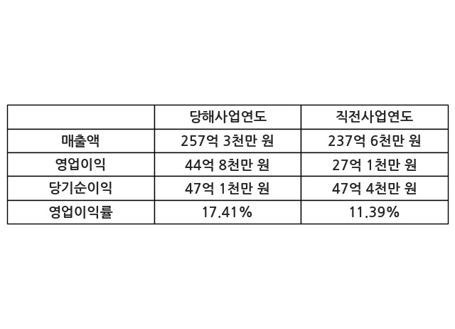이번사업연도의 매출액은 직전사업연도 대비 8.29% 증가한 257억 3천만 원, 영업이익은 44억 8천만 원, 당기순이익은 47억 1천만 원이라고 공시했다.