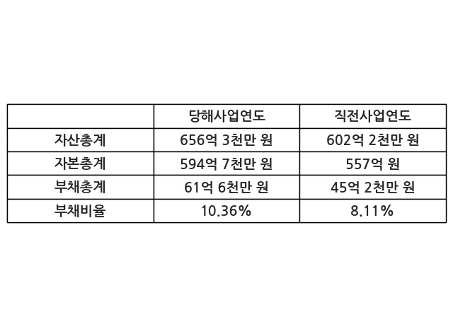 또한, 이번사업연도의 자산총계는 656억 3천만 원으로 직전사업연도 대비 8.98% 증가한 한편, 부채총계는 61억 6천만 원으로 36.35% 증가, 자본총계는 594억 7천만 원으로 6.76% 증가했다.