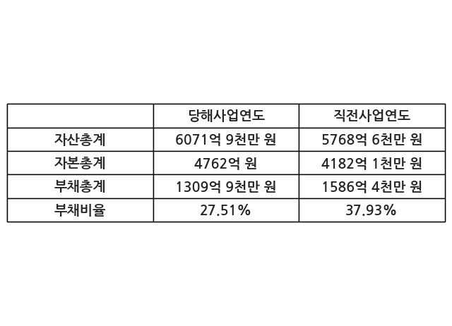 또한, 이번사업연도의 자산총계는 6071억 9천만 원으로 직전사업연도 대비 5.26% 증가한 한편, 부채총계는 1309억 9천만 원으로 -17.43% 감소, 자본총계는 4762억 원으로 13.86% 증가했다.