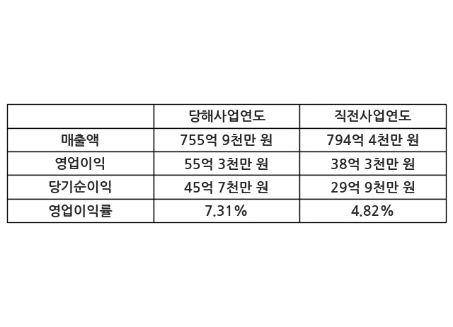 이번사업연도의 매출액은 직전사업연도 대비 -4.85% 감소한 755억 9천만 원, 영업이익은 55억 3천만 원, 당기순이익은 45억 7천만 원이라고 공시했다.