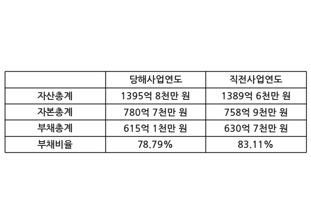 또한, 이번사업연도의 자산총계는 1395억 8천만 원으로 직전사업연도 대비 0.45% 증가한 한편, 부채총계는 615억 1천만 원으로 -2.47% 감소, 자본총계는 780억 7천만 원으로 2.87% 증가했다.