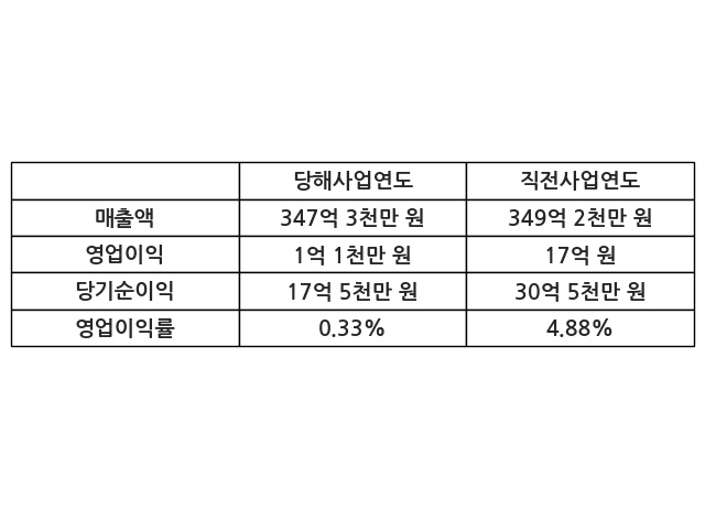 이번사업연도의 매출액은 직전사업연도 대비 -0.55% 감소한 347억 3천만 원, 영업이익은 1억 1천만 원, 당기순이익은 17억 5천만 원이라고 공시했다.