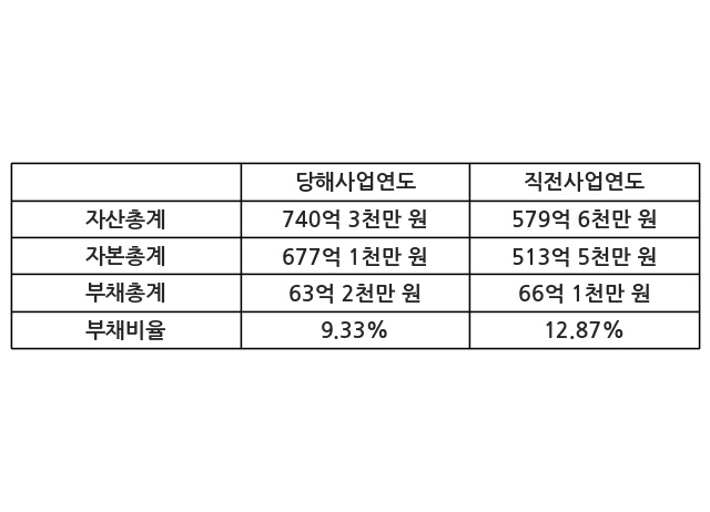 또한, 이번사업연도의 자산총계는 740억 3천만 원으로 직전사업연도 대비 27.71% 증가한 한편, 부채총계는 63억 2천만 원으로 -4.4% 감소, 자본총계는 677억 1천만 원으로 31.85% 증가했다.