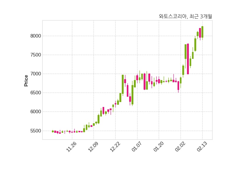 한편, 와토스코리아의 14시 35분 현재주가는 8,250원으로 직전 거래일 대비 290원(+3.64%) 상승이며, 거래량은 37,710주이다.