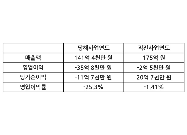 이번사업연도의 매출액은 직전사업연도 대비 -19.19% 감소한 141억 4천만 원, 영업이익은 -35억 8천만 원, 당기순이익은 -11억 7천만 원이라고 공시했다.