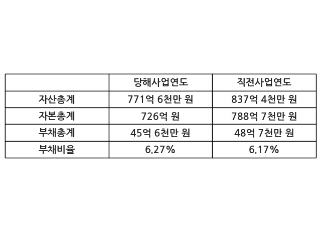 또한, 이번사업연도의 자산총계는 771억 6천만 원으로 직전사업연도 대비 -7.86% 감소한 한편, 부채총계는 45억 6천만 원으로 -6.45% 감소, 자본총계는 726억 원으로 -7.95% 감소했다.