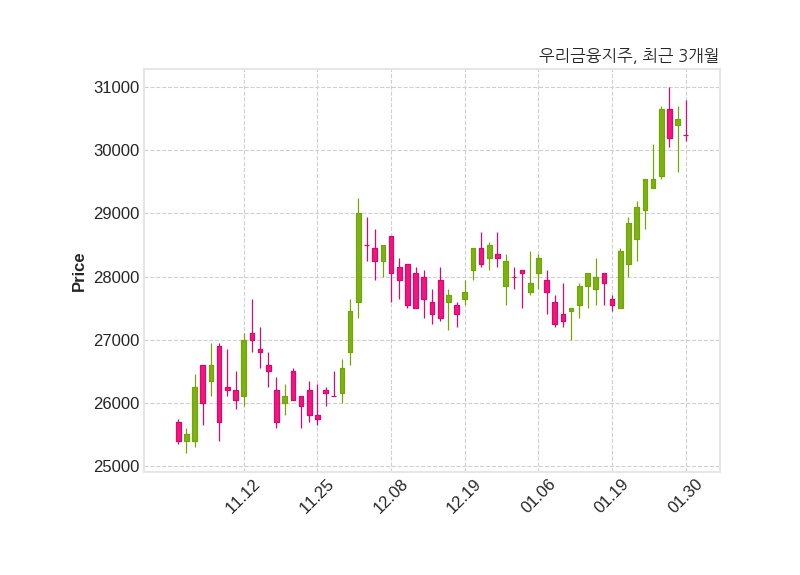 우리금융지주는 특별관계자 (주)우리금융지주 우리사주조합의 지분율이 7.7%에서 8.72%로 변동했다고 30일 공시했다. 한편, 우리금융지주는 장 마감 이후 해당 기업공시를 발표했으며 오늘 종가가 30,250원, 거래량은 2,015,806주로, 직전 거래일 대비 250원(-0.82%) 하락했다.