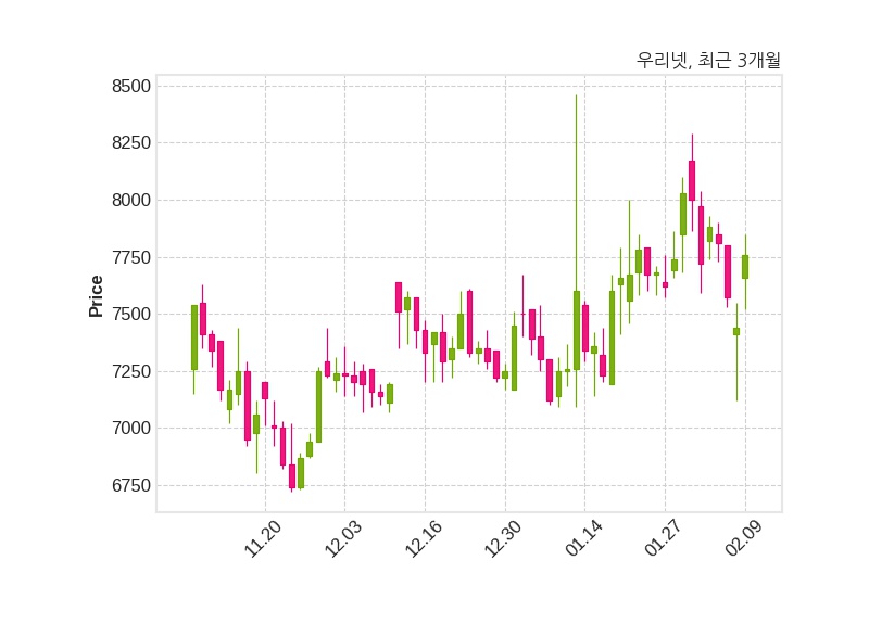 한편, 우리넷은 장 마감 이후 해당 기업공시를 발표했으며 오늘 종가가 7,760원, 거래량은 199,660주로, 직전 거래일 대비 320원(+4.3%) 상승했다.