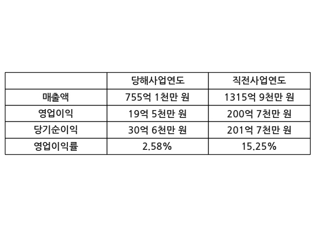 이번사업연도의 매출액은 직전사업연도 대비 -42.62% 감소한 755억 1천만 원, 영업이익은 19억 5천만 원, 당기순이익은 30억 6천만 원이라고 공시했다.