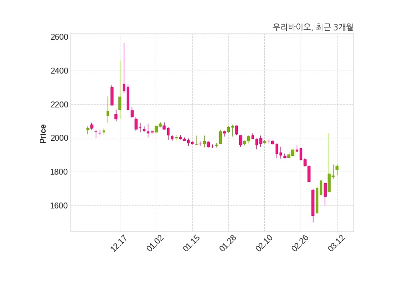 한편, 우리바이오는 장 마감 이후 해당 기업공시를 발표했으며 오늘 종가가 1,836원, 거래량은 188,920주로, 직전 거래일 대비 59원(+3.32%) 상승했다.