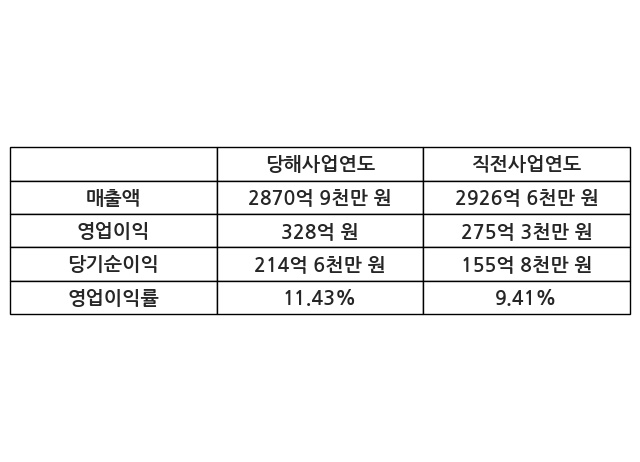이번사업연도의 매출액은 직전사업연도 대비 -1.91% 감소한 2870억 9천만 원, 영업이익은 328억 원, 당기순이익은 214억 6천만 원이라고 공시했다.