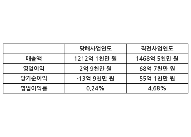이번사업연도의 매출액은 직전사업연도 대비 -17.46% 감소한 1212억 1천만 원, 영업이익은 2억 9천만 원, 당기순이익은 -13억 9천만 원이라고 공시했다.