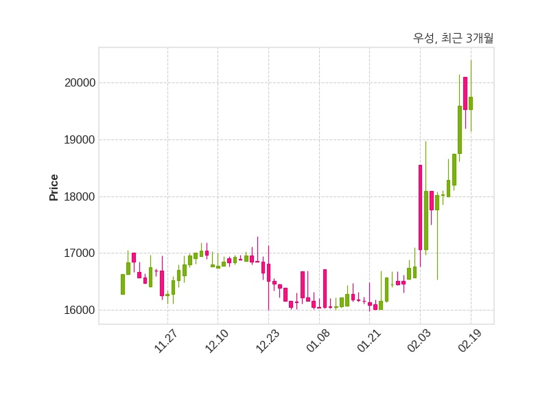한편, 우성은 장 마감 이후 해당 기업공시를 발표했으며 오늘 종가가 19,750원, 거래량은 10,879주로, 직전 거래일 대비 220원(+1.13%) 상승했다.