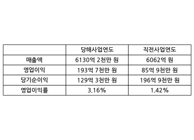 이번사업연도의 매출액은 직전사업연도 대비 1.13% 증가한 6130억 2천만 원, 영업이익은 193억 7천만 원, 당기순이익은 129억 3천만 원이라고 공시했다.