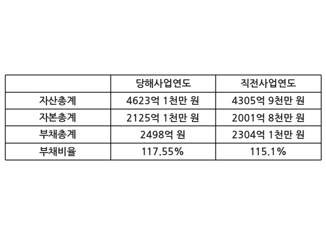 또한, 이번사업연도의 자산총계는 4623억 1천만 원으로 직전사업연도 대비 7.37% 증가한 한편, 부채총계는 2498억 원으로 8.41% 증가, 자본총계는 2125억 1천만 원으로 6.16% 증가했다.