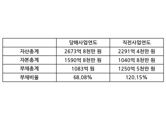 또한, 이번사업연도의 자산총계는 2673억 8천만 원으로 직전사업연도 대비 16.69% 증가한 한편, 부채총계는 1083억 원으로 -13.39% 감소, 자본총계는 1590억 8천만 원으로 52.84% 증가했다.