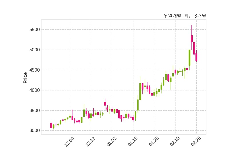 한편, 우원개발의 09시 41분 현재주가는 4,725원으로 직전 거래일 대비 160원(-3.28%) 하락이며, 거래량은 171,062주이다.